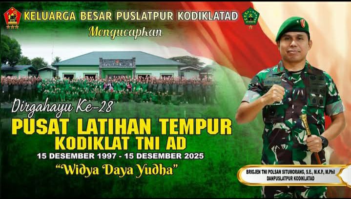 Cipatat, Jawa Barat – Di balik rindangnya pepohonan dan gemuruh latihan, Pusat Latihan Tempur (Puslatpur) Kodiklat TNI AD merayakan hari jadinya yang ke-28. Bukan sekadar angka, usia ini menjadi saksi bisu transformasi dan dedikasi Puslatpur dalam menempa prajurit-prajurit tangguh. Tema “Widya Daya Yudha” bukan hanya slogan, melainkan ruh yang menggerakkan setiap langkah dan inovasi di pusat latihan ini.