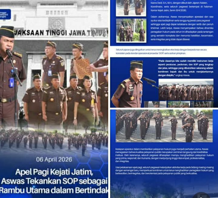 SURABAYA – Semangat kedisiplinan dan profesionalisme kembali ditunjukkan oleh seluruh jajaran Kejaksaan Tinggi Jawa Timur (Kejati Jatim). Pada Senin (6/4/2026) pagi, kegiatan rutin Apel Pagi digelar dengan khidmat di halaman kantor Kejati Jatim, dipimpin langsung oleh Asisten Pengawasan (Aswas), Dr. I Ketut Kasna Dedi, S.H., M.H.