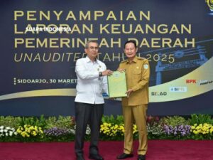 Acara penyerahan dokumen penting tersebut berlangsung di Sidoarjo, pada Senin (30/3/2026). Dokumen LKPD tersebut diterima langsung oleh Kepala BPK Perwakilan Provinsi Jawa Timur, Yuan Candara Djaisin.