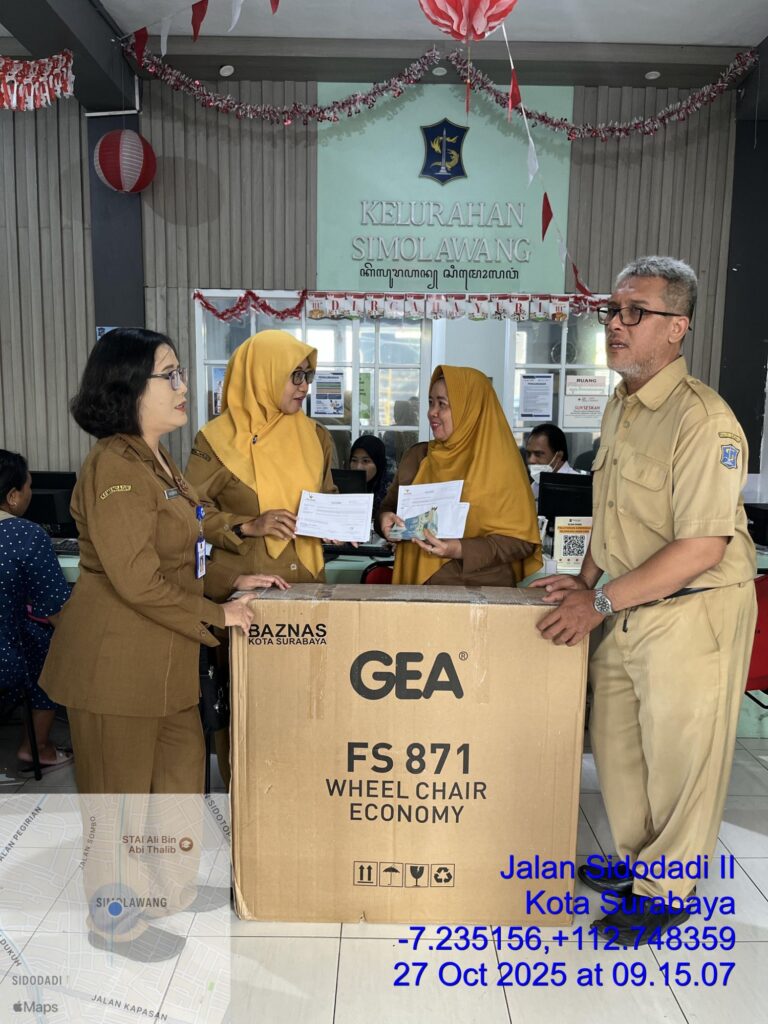 Surabaya. berita kabar terkini.comDalam upaya meningkatkan kesejahteraan masyarakat dan mendorong kemandirian ekonomi warga, Camat Simokerto Noervita Amin menyerahkan secara langsung bantuan kursi roda dan modal usaha dari Badan Amil Zakat Nasional (BAZNAS) kepada warga penerima manfaat pada Senin, 27 Oktober 2025.