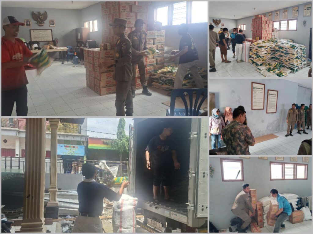 • Seluruh peserta kegiatan bekerja sama secara gotong royong untuk menurunkan bantuan sembako dari kendaraan pengangkutan berupa truk ke dalam Ruang PKK Kantor Kelurahan.