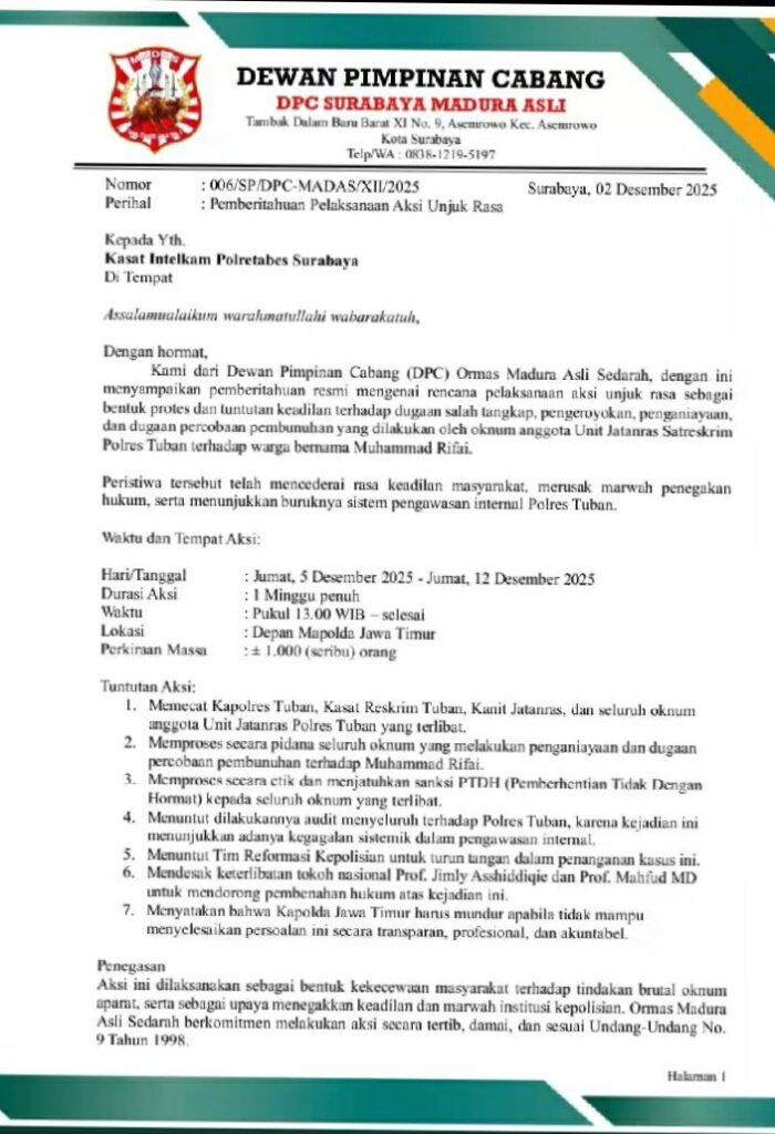 Surabaya, 2 Desember 2025 – Dewan Pimpinan Cabang (DPC) Ormas Madura Asli Sedarah (MADAS) Surabaya mengumumkan rencana aksi unjuk rasa besar-besaran yang akan digelar selama satu minggu penuh, mulai Jumat, 5 Desember hingga Jumat, 12 Desember 2025. Aksi ini merupakan bentuk protes dan tuntutan keadilan atas dugaan salah tangkap, pengeroyokan, penganiayaan, serta percobaan pembunuhan yang diduga dilakukan oleh oknum anggota Unit Jatanras Satreskrim Polres Tuban terhadap warga bernama Muhammad Rifai.