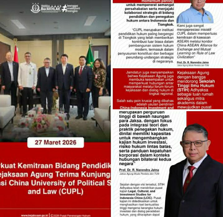 Jaksa Agung Muda Perdata dan Tata Usaha Negara (Jamdatun) Prof. Dr. R. Narendra Jatna, S.H., LL.M sebagai perwakilan Kejaksaan Agung Republik Indonesia secara resmi menerima kunjungan kehormatan (Courtesy Call) dari delegasi China University of Political Science and Law (CUPL) pada hari Kamis, 26 Maret 2026 di Ruang Rapat Utama Gedung Utama Kejaksaan Agung, Jakarta Pusat. Pertemuan yang diisi dengan diskusi konstruktif ini bertujuan untuk memperkuat kemitraan akademis dan profesional antara lembaga hukum Indonesia dengan institusi pendidikan hukum ternama dari China.