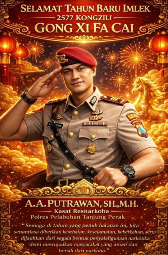SURABAYA, 17 FEBRUARI 2026 – Dalam suasana penuh harapan dan kehangatan menyambut pergantian tahun Imlek, Kasat Resnarkoba Polres Pelabuhan Tanjung Perak, A.A. Putrawan, SH., M.H., resmi mengucapkan selamat Tahun Baru Imlek 2577 Kongzili kepada seluruh masyarakat, khususnya komunitas etnis Tionghoa di wilayah kerja Polres Pelabuhan Tanjung Perak dan se-Jawa Timur. Pesan ucapan yang disampaikan melalui poster perayaan yang megah dan penuh makna ini juga membawa amanat penting tentang perlindungan masyarakat dari ancaman narkotika, sebagai bentuk komitmen institusi kepolisian dalam menciptakan lingkungan yang aman, damai, dan bersih dari zat berbahaya.