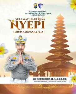 Surabaya (19 Maret 2026) – Kasubdit Regident Ditlantas Polda Jawa Timur AKBP Yanto Mulyanto P. S.H., S.I.K., M.H., M.Si., bersama seluruh jajaran mengucapkan ucapan selamat Hari Raya Nyepi Tahun Baru Saka 1948 kepada seluruh umat Hindu di Indonesia, khususnya yang berada di wilayah Jawa Timur. Perayaan yang jatuh pada hari ini menjadi momen suci yang membawa makna mendalam tentang refleksi diri, kejernihan batin, serta hubungan yang harmonis antara manusia, alam semesta, dan Sang Pencipta.