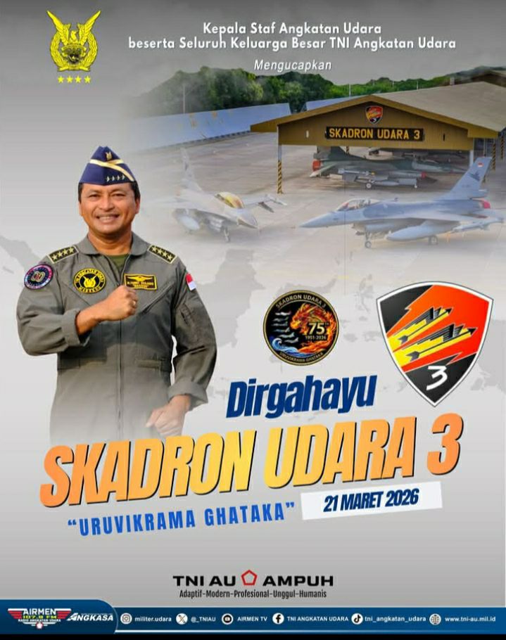 Surabaya, Jawa Timur – 21 Maret 2026 – Suasana penuh kebanggaan dan haru menghiasi kompleks Markas Skadron Udara 3 “Uruvikrama Ghataka” pada hari ini, tepat pada momen perayaan hari jadi yang ke-XX (sesuai tahun berdirinya) dari salah satu skadron unggulan TNI Angkatan Udara. Dalam acara yang dihadiri oleh ratusan personel beserta keluarga mereka, Kepala Staf Angkatan Udara (KSAU) beserta rombongan keluarga besar TNI Angkatan Udara datang secara langsung untuk menyampaikan ucapan selamat dan apresiasi yang mendalam kepada seluruh anggota Skadron Udara 3 yang telah memberikan kontribusi luar biasa bagi keamanan dan pertahanan wilayah udara negara Republik Indonesia.
