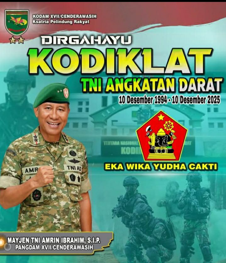 Jayapura, 10 Desember 2025 – Komando Daerah Militer (KODAM) XVII/Cenderawasih menggelar acara syukuran dalam rangka memperingati Hari Ulang Tahun (HUT) Komando Pembinaan Doktrin, Pendidikan dan Latihan (KODIKLAT) TNI Angkatan Darat (AD). Acara yang berlangsung khidmat ini menjadi momentum penting untuk meneguhkan komitmen dalam meningkatkan profesionalisme prajurit, khususnya di wilayah paling timur Indonesia.