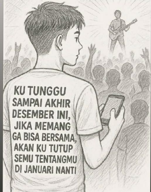 Jakarta (16/12) – Suatu gambar sketsa yang menunjukkan sosok seorang pemuda menghadiri konser musik tengah menjadi perbincangan hangat di berbagai platform daring akhir-akhir ini. Yang membuatnya menarik adalah tulisan panjang di bagian belakang kaos yang dikenakannya: “KU TUNGGU SAMPAI AKHIR DESEMBER INI, JIKA MEMANG GA BISA BERSAMA, AKAN KU TUTUP SEMU TENTANGMU DI JANUARI NANTI”. Pesan yang penuh emosi ini tidak hanya menyentuh hati banyak orang, tetapi juga membangkitkan rasa ingin tahu mengenai kisah yang tersembunyi di baliknya.