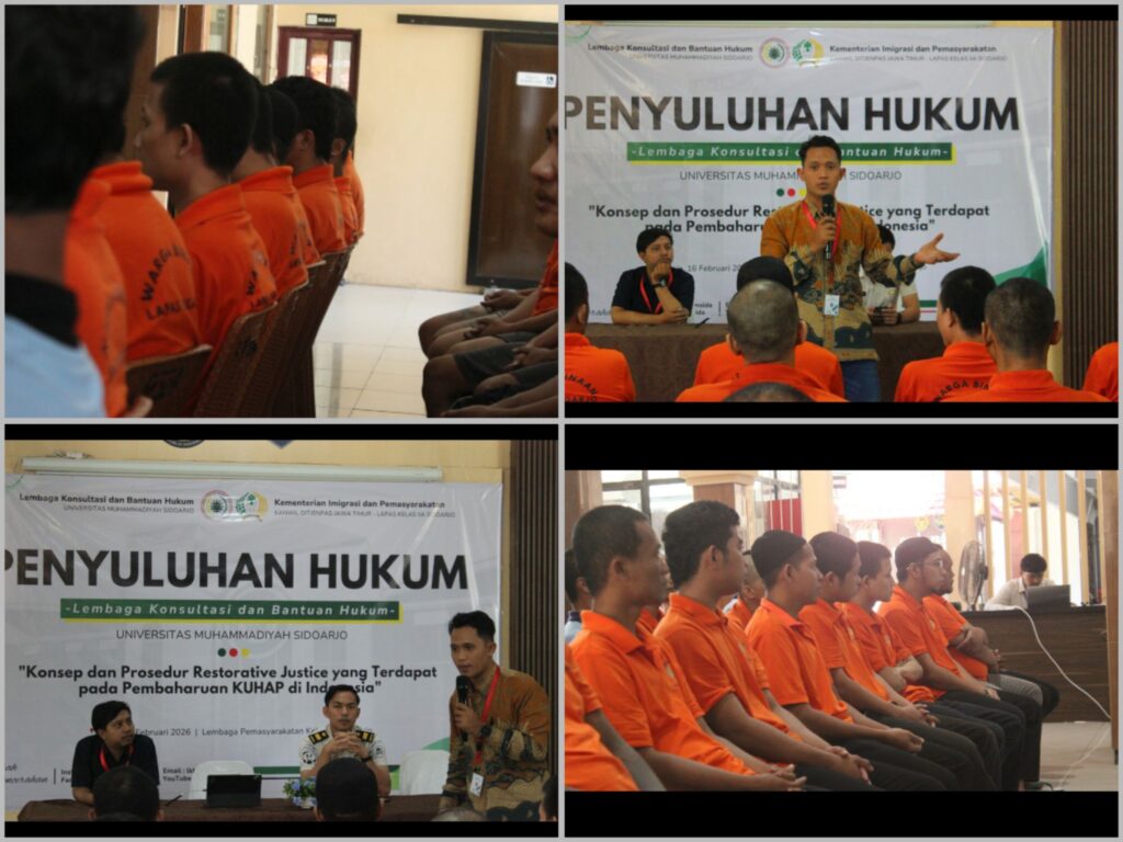 Kegiatan ini mengangkat tema “Konsep dan Prosedur Restorative Justice yang Terdapat pada Pembaharuan KUHAP di Indonesia” yang disampaikan oleh tim dari Lembaga Konsultasi dan Bantuan Hukum UMSIDA. Penyuluhan ini bertujuan untuk memberikan pemahaman hukum kepada Warga Binaan Pemasyarakatan (WBP) terkait perkembangan sistem peradilan pidana, khususnya konsep restorative justice yang saat ini menjadi bagian penting dalam pembaruan Kitab Undang-Undang Hukum Acara Pidana (KUHAP).