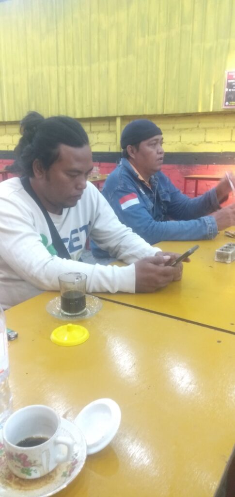 Surabaya-Suasana: Warung kopi ini terlihat sederhana namun hidup dengan dinding berwarna kuning cerah. Pencahayaan redup menambah kesan akrab dan santai.Tokoh Utama: Dua pria menjadi fokus utama.Pria di depan: Mengenakan kaus lengan panjang putih, rambut dikuncir, sedang asyik dengan ponselnya. Mungkin sedang bermain game, melihat media sosial, atau membalas pesan.Pria di belakang: Memakai jaket denim dengan patch bendera Indonesia di lengan. Ia tampak sedang mengaduk minumannya, mungkin sambil mengobrol atau sekadar menikmati suasana.Detail Meja:Kopi: Ada dua cangkir kopi yang berbeda. Satu kopi hitam dalam gelas dengan tutup kuning, yang satunya lagi menggunakan cangkir bermotif bunga. Ini menunjukkan bahwa warung kopi ini menyajikan berbagai jenis kopi atau pelanggan memiliki preferensi masing-masing.Asbak: Keberadaan asbak menunjukkan bahwa warung kopi ini memperbolehkan pelanggan untuk merokok.Botol Air Mineral: Botol air mineral menunjukkan warung kopi ini juga menjual minuman lain selain kopi.Interpretasi: Foto ini menggambarkan kehidupan sosial yang sederhana dan khas di Indonesia. Warung kopi bukan hanya tempat untuk minum kopi, tetapi juga tempat untuk bersantai, bertemu teman, dan bertukar cerita. Bendera Indonesia di jaket pria tersebut bisa jadi menunjukkan rasa cinta tanah air atau semangat nasionalisme.