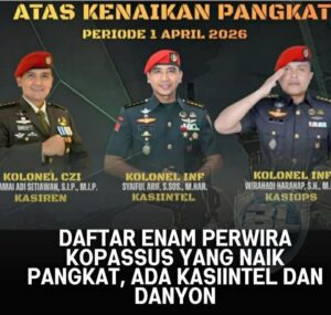 JAKARTA – Sebuah momen penting dan penuh kebanggaan terjadi di lingkungan Komando Pasukan Khusus (Kopassus) TNI Angkatan Darat. Sebanyak enam orang Perwira Menengah (Pamen) Kopassus resmi menerima kenaikan pangkat sekaligus dipercaya untuk menduduki jabatan strategis yang baru. Pelantikan dan penyerahan tugas serta tanggung jawab ini menjadi bukti pengakuan atas dedikasi, loyalitas, dan kompetensi yang telah ditunjukkan oleh para perwira elit tersebut selama mengabdi kepada negara.