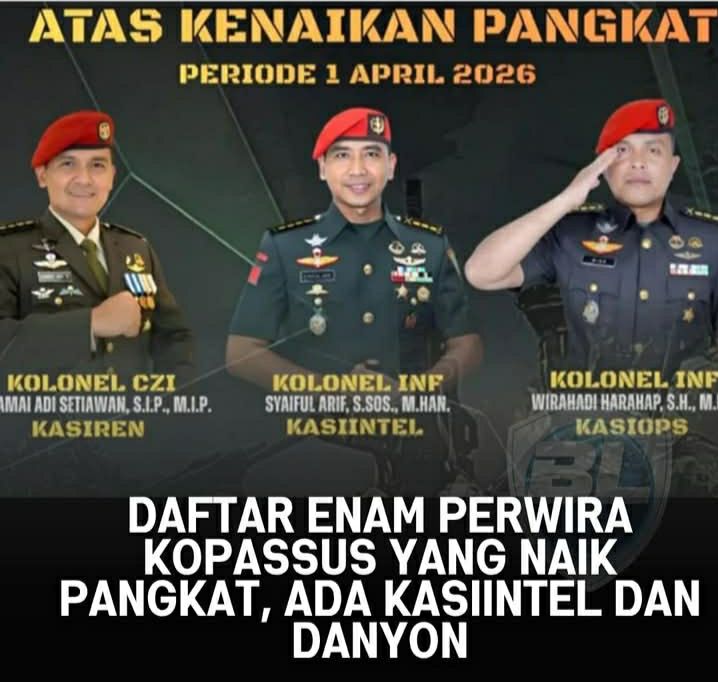 Informasi resmi ini disampaikan melalui keterangan yang diterbitkan oleh Pengrup4kopassus, pada Rabu (1/4/2026). Dalam kesempatan tersebut, disampaikan harapan besar agar para perwira yang baru saja naik pangkat dan menjabat posisi baru ini senantiasa diberikan kesehatan yang prima, panjang umur, dan selalu diberikan kekuatan untuk mengemban amanah dengan sebaik-baiknya demi kejayaan bangsa dan negara Indonesia.