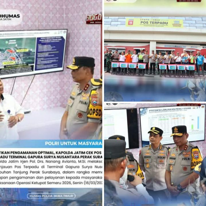 SURABAYA – Kapolda Jawa Timur Irjen Pol. Drs. Nanang Avianto, M.Si. secara langsung melaksanakan peninjauan dan pemeriksaan terhadap Pos Terpadu yang telah dibentuk di Terminal Gapura Surya Nusantara, Pelabuhan Tanjung Perak Surabaya, pada hari Senin (16/03/2026). Kegiatan ini dilakukan dalam rangka memastikan kesiapan penuh terkait pengamanan dan pelayanan kepada masyarakat pada pelaksanaan Operasi Ketupat Semeru 2026, yang akan mengawal pergerakan masyarakat menjelang Hari Raya Idulfitri 1447 Hijriah.