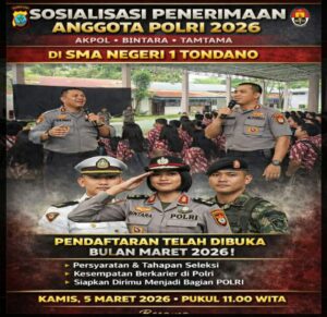 Tondano, 5 Maret 2026 – Personel Satuan Binmas (Bimbingan Masyarakat) Polres atau Polsek yang wilayah hukum mencakup Tondano melaksanakan kegiatan sosialisasi penerimaan Calon Anggota Kepolisian Republik Indonesia (Polri) Tahun 2026 di SMA Negeri 1 Tondano pada Kamis (5/3/2026). Kegiatan yang bertujuan untuk memberikan pemahaman mendalam kepada para siswa tentang kesempatan mengabdi kepada bangsa dan negara melalui institusi Polri berlangsung secara aman, tertib, dan lancar di aula sekolah yang dihadiri oleh ratusan siswa dari berbagai kelas.