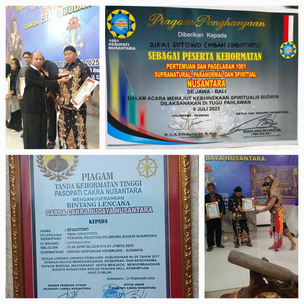 Surabaya,BERITAKABARTERKINI.COM.Piagam Tanda Kehormatan Pasopati Cakra Nusantara baru-baru ini menganugerahkan Bintang Lencana Garda Cakra Budaya Nusantara kepada Rifai Suyowo, yang lebih dikenal dengan gelar Mbah Singotirto. Penghargaan ini diberikan sebagai pengakuan atas jasa dan dedikasi Mbah Singotirto dalam menjaga, melestarikan, dan melindungi budaya Nusantara.