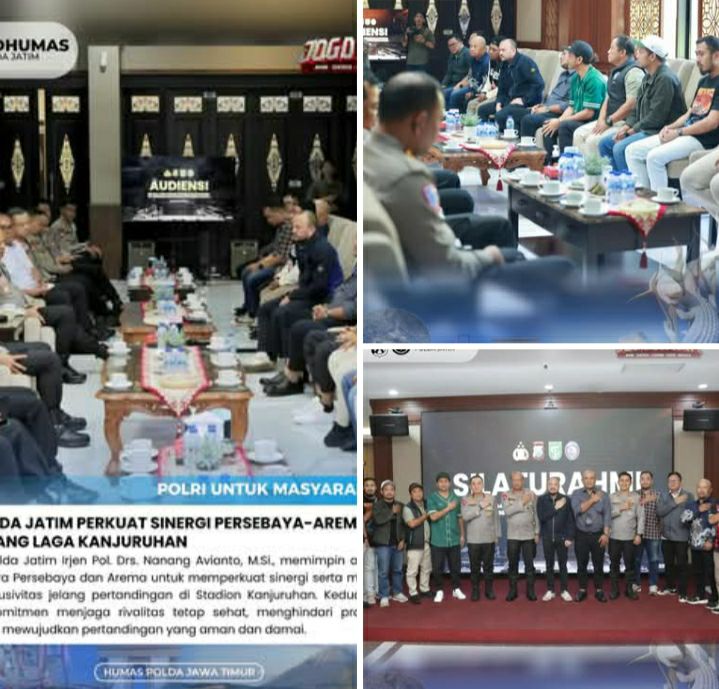 SURABAYA – Polda Jawa Timur menggelar audiensi bersama manajemen klub sepak bola Persebaya Surabaya dan Arema Malang pada hari Rabu (1/4/2026) di Ruang Selasar Mapolda Jatim, Surabaya. Kegiatan yang dipimpin langsung oleh Kapolda Jatim Irjen Pol. Drs. Nanang Avianto, M.Si., memiliki tujuan utama untuk memperkuat sinergi antar pihak serta meredam potensi konflik yang mungkin muncul jelang pertandingan BRI Super League musim 2025/2026 yang akan digelar di Stadion Kanjuruhan, Malang.
