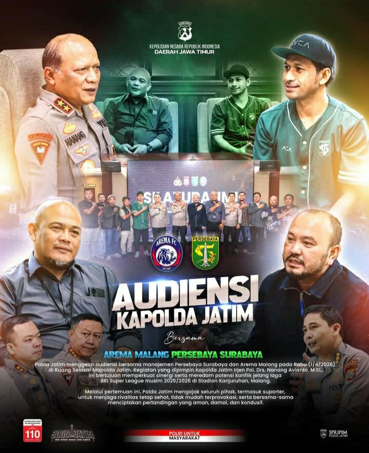 SURABAYA – Kepolisian Daerah Jawa Timur (Polda Jatim) menggelar audiensi khusus bersama manajemen klub sepak bola Persebaya Surabaya dan Arema Malang pada hari Rabu (1/4/2026) di Ruang Selasar Mapolda Jatim, Surabaya. Kegiatan yang dipimpin langsung oleh Kepala Kepolisian Daerah (Kapolda) Jatim Irjen Pol. Drs. Nanang Avianto, M.Si., memiliki tujuan utama untuk memperkuat sinergi antar pihak terkait serta mencegah dan meredam potensi konflik yang mungkin muncul jelang pertandingan BRI Super League musim 2025/2026 yang akan digelar di Stadion Kanjuruhan, Malang.