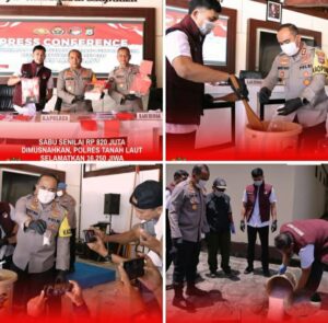 TANAH LAUT, KALIMANTAN SELATAN – Polres Tanah Laut menggelar kegiatan Press Conference sekaligus pemusnahan barang bukti narkotika hasil ungkapan berbagai kasus pada hari Selasa (17/3), yang dilaksanakan di Joglo Wicaksana Laghawa Mapolres Tanah Laut. Kegiatan yang dipimpin langsung oleh Kapolres Tanah Laut AKBP Ricky Boy Siallagan, S.I.K., M.I.K., ini juga dihadiri oleh Kasatres Narkoba Iptu M. Firmansyah Baso, S.Tr.K., M.H., serta Kasi Humas AKP Hari Setiawan, A.Md., beserta rombongan awak media dari berbagai media massa lokal di Tanah Laut.