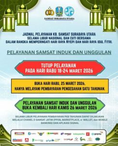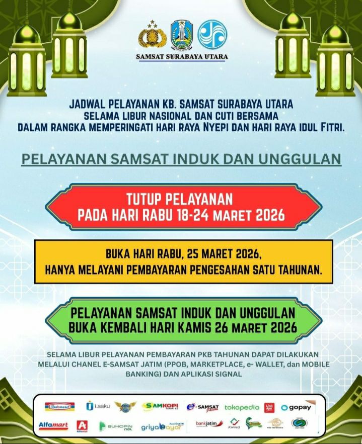 SURABAYA, JAWA TIMUR – Kantor SAMSAT Surabaya Utara mengumumkan penyesuaian jadwal pelayanan selama periode libur nasional dan cuti bersama dalam rangka memperingati Hari Raya Nyepi dan Hari Raya Idul Fitri 1 Syawal 1447 H. Layanan tatap muka di SAMSAT Induk dan SAMSAT Unggulan akan ditutup selama tujuh hari berturut-turut, mulai dari hari Rabu (18/3/2026) hingga Rabu (24/3/2026).