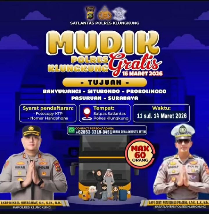 KLUNGKUNG, BALI, 10 Maret 2026 – Satuan Lalu Lintas (Satlantas) Polres Klungkung mengumumkan pelaksanaan program “Mudik Gratis Polres Klungkung” yang akan berlangsung pada 16 Maret 2026. Program yang bertujuan untuk memudahkan masyarakat Klungkung yang ingin melakukan perjalanan mudik atau pulang kampung ini akan mengantarkan peserta ke berbagai kota tujuan di Jawa Timur, antara lain Banyuwangi, Situbondo, Probolinggo, Pasuruan, dan Surabaya.