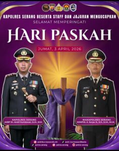 SERANG – Kepala Kepolisian Resor (Kapolres) Serang, AKBP Dr. Andri Kurniawan, S.I.K., M.H., beserta seluruh jajaran perwira, bintara, dan tamtama Polres Serang menyampaikan ucapan selamat memperingati Hari Paskah. Ucapan ini ditujukan khususnya bagi seluruh umat Kristiani yang sedang merayakan kemenangan hidup dan kebangkitan Yesus Kristus.