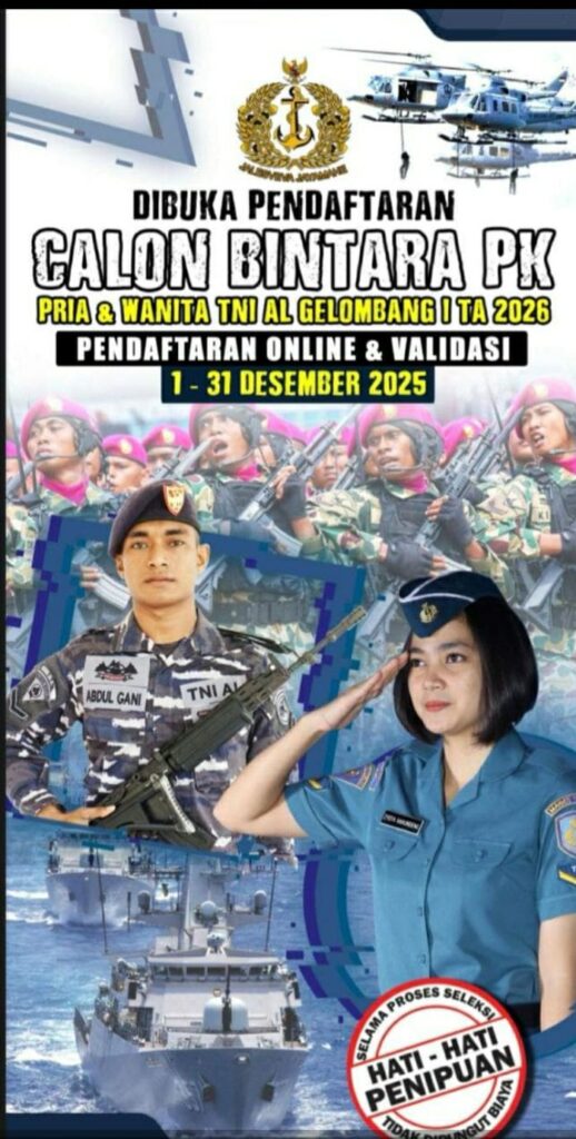 [Kota], 23 November 2025 – Kabar gembira bagi putra-putri terbaik bangsa yang bercita-cita mengabdikan diri kepada negara melalui Tentara Nasional Indonesia Angkatan Laut (TNI AL). TNI AL secara resmi membuka pendaftaran Calon Bintara Prajurit Karier (PK) Gelombang I Tahun Anggaran 2026.