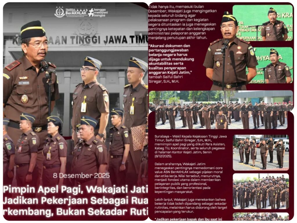 Surabaya, 8 Desember 2025 – Wakil Kepala Kejaksaan Tinggi Jawa Timur (Wakajati Jatim), Saiful Bahri Siregar, S.H., M.H., menggugah kesadaran seluruh personel Kejati Jatim dalam apel pagi yang berlangsung khidmat di halaman kantor, Senin (8/12/2025).